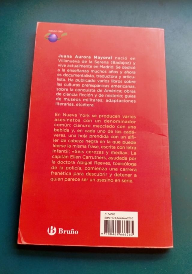 Seis cerezas y media. Juana Aurora Mayoral. Editorial Bruño, Aug 6, 2020 - Juvenile Fiction - 160 pages. En Nueva York se producen varios asesinatos con un denominador común: cianuro mezclado con una bebida y, en cada uno de los cadáveres, una hoja prendida con un alfiler de cabeza negra en la que puede leerse la misma frase, escrita con.
