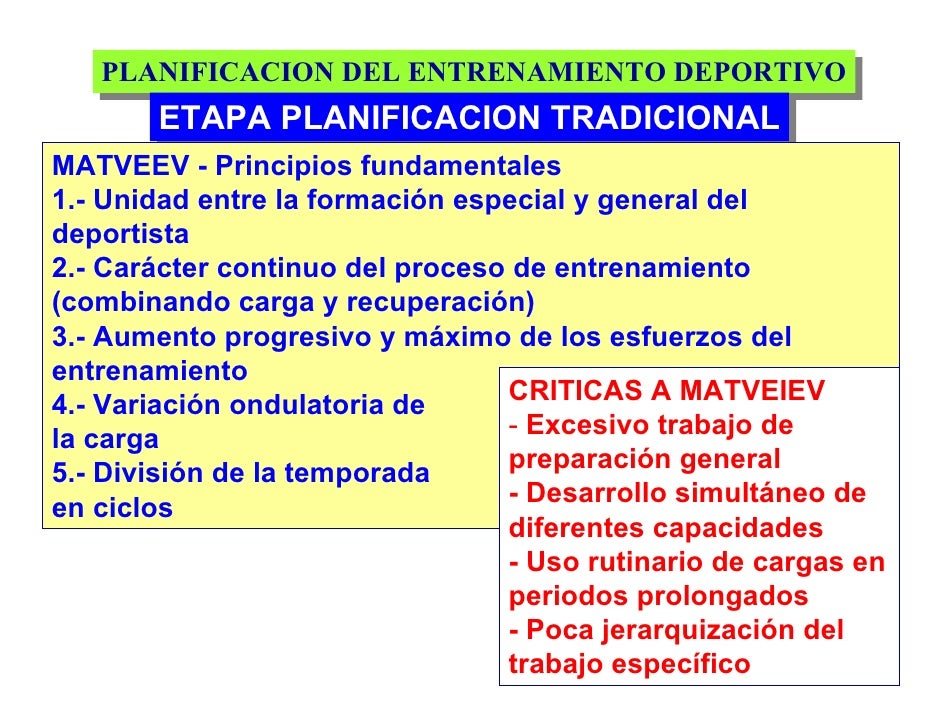 de la planificación del entrenamiento deportivo, la periodización del entrenamiento . La estructura del ruso Matveiev se vio inmersa, ya para los citados veinte últimos años de la centuria pasada, en un análisis crítico a. tiene su génesis en la estructuración de Bloques de Verjoshanski, está resultando muy novedoso y llamativo