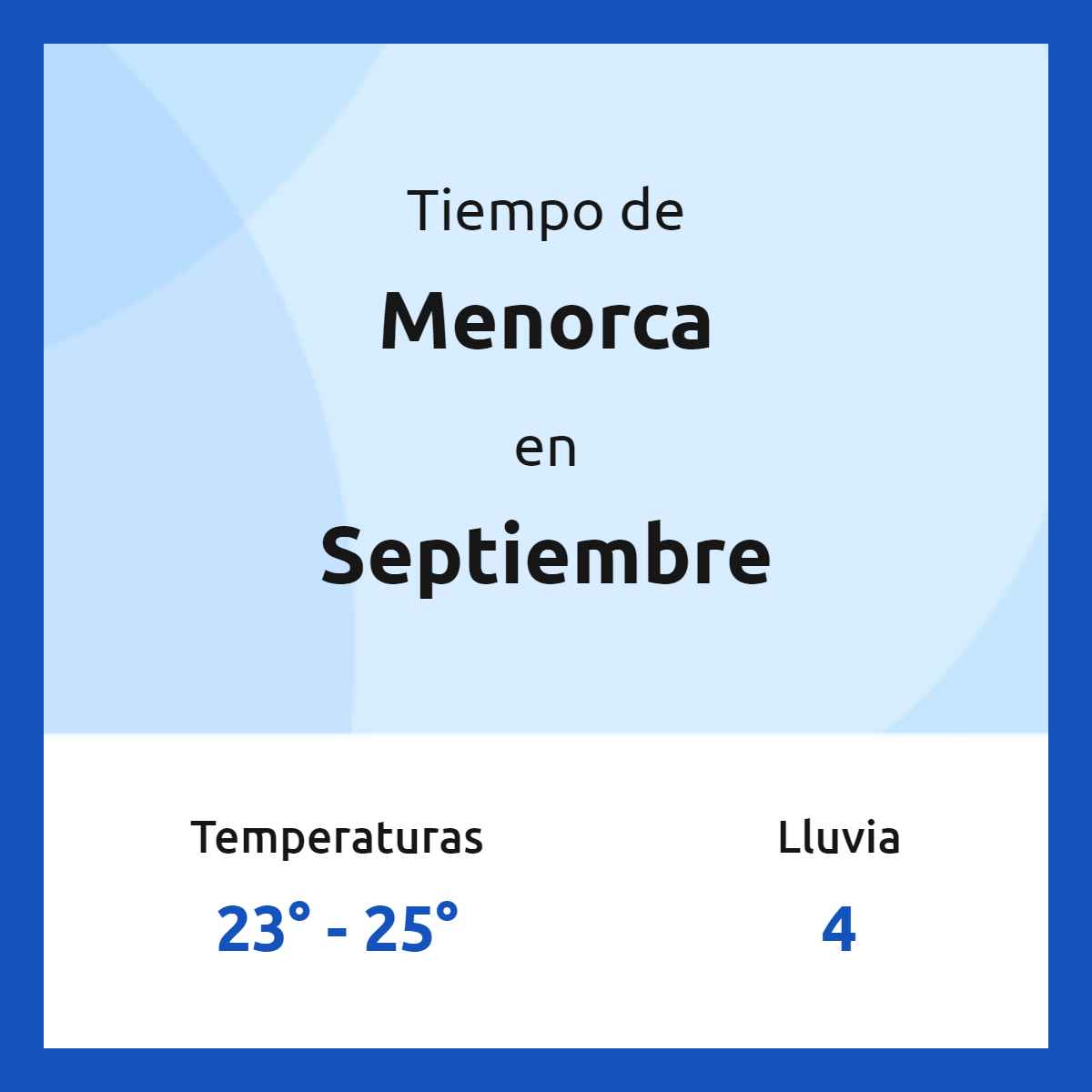 EL TIEMPO EN MENORCA EN SEPTIEMBRE. 26º C (máx.) - 19º C (mín.) | 12,5h de Sol al día | 5 días de lluvia. Comienza el otoño pero el clima en Menorca aún es cálido. Igualmente te sugerimos incluir en la maleta algún abrigo ligero y un chubasquero. Mallorca tiene mucho para ofrecer, utiliza nuestro sitio web como tu planificador de.