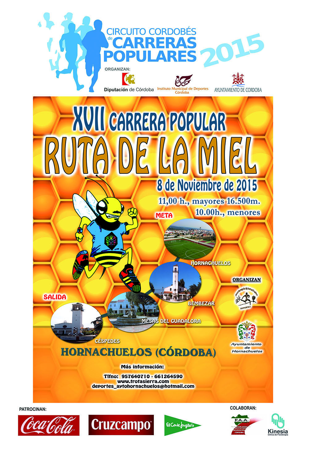 Este 2021 será la XXII edición. La carrera absoluta tendrá un recorrido de 16.500m, con salida en la pedanía de Céspedes y llegada en Hornachuelos. Las categorías inferiores se disputarán en Hornachuelos.. Resultados ( 2018 ) ( 2017 ) ( 2016 ) ( 2015 ) ( 2014 ) ( 2013 ) ( 2012 ) CUADRO DE HONOR DE LA C.P. RUTA DE LA MIEL.