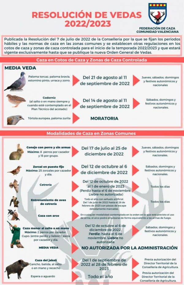 Como novedad destaca la prohibición de la caza de la tórtola. Cuadro resumen sobre los periodos de caza por especie en la Comunidad Valenciana para la temporada 2021/2022. Compartimos a continuación las fechas por especies en las zonas comunes incluidas en la orden de vedas de la Comunidad Valenciana para la próxima temporada de caza.